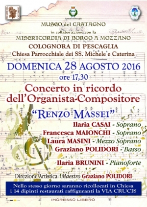 Domenica 28 agosto 2016, con un concerto organizzato dal Museo del Castagno in collaborazione con la nostra Fraternita di Misericordia, sarà ricordato, a Colognora di Pescaglia, il musicista Renzo Massei, organista e compositore autodidatta, che viveva a Villabona di Pescaglia.