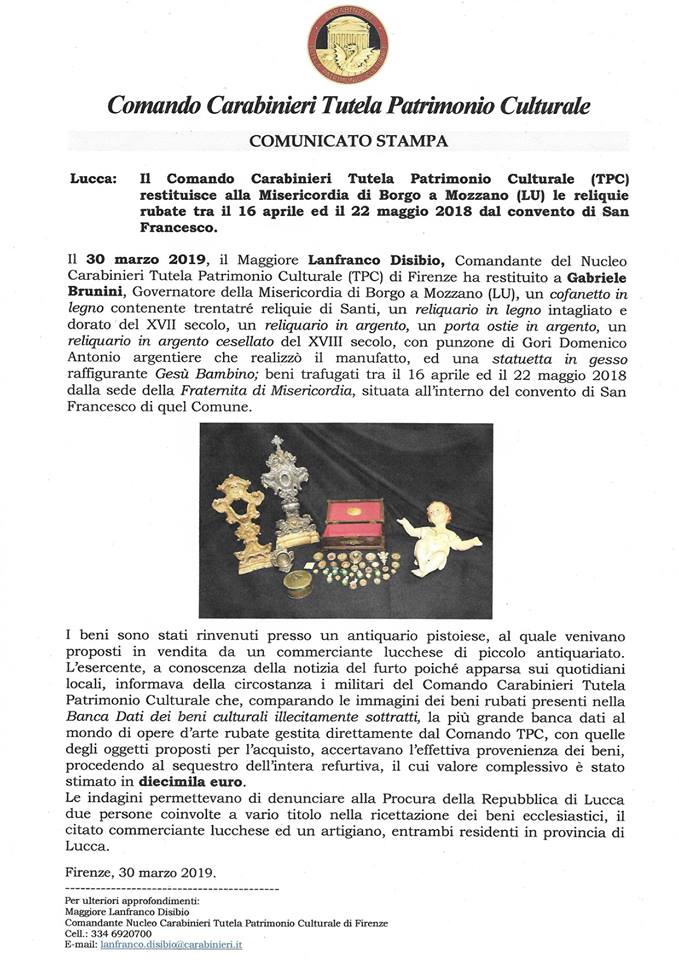 Finalmente restituiti gli oggetti sacri rubati al nostro convento di S. Francesco. Ora vanno chiarite tutte le responsabilità dei due indagati.